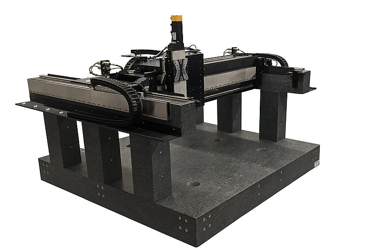 - XY gantry for overhead motion. Travel ranges to 1 m × 2 m