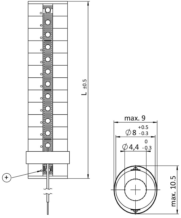 PICMA® Stack multilayer ring actuator; PICMA® piezo actuator drive; 25 µm travel range (open loop); 8 mm × 4.4 mm × 36 mm (OD × ID × L); 850 N feed force; vacuum-compatible to 10-9 hPa; connecting wires, PTFE-insulated, AWG 30, Ø 0.61 mm; cable length 0.1 m