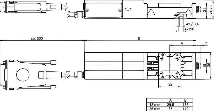 Compact linear stage; 2-phase stepper motor; 13 mm travel range; 30 N load capacity; 10 mm/s maximum velocity; fine-threaded spindle; incremental linear encoder, 5 nm sensor resolution, A/B quadrature, RS-422; 0.5 m cable length; 36 mm width