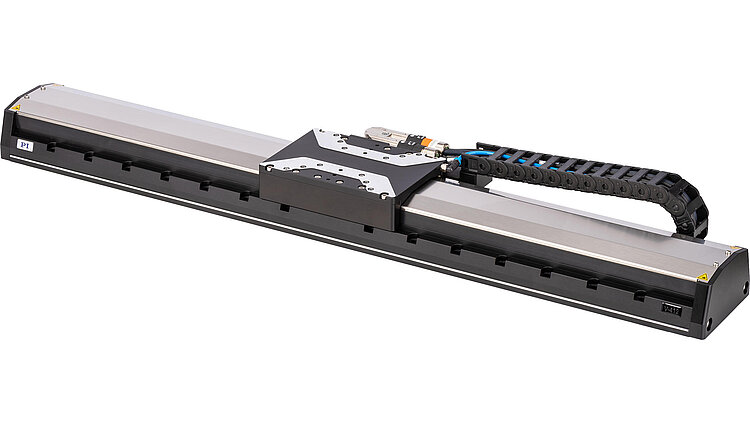High-load linear stage; ironless 3-phase linear motor; 204 mm travel range; 400 N load capacity; 2000 mm/s maximum velocity; absolute linear encoder, 1 nm sensor resolution, EnDat 2.2; drag chain