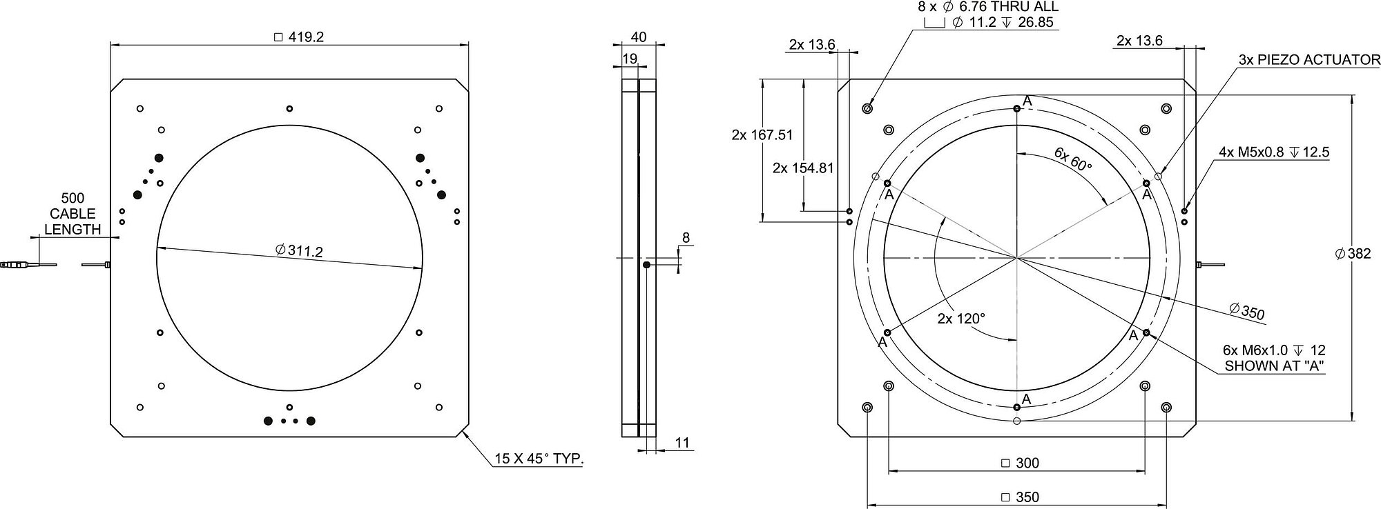 Phase shifter for optics, with tip/tilt error correction; 15 µm travel range (open loop); clear aperture, Ø 311 mm; bare wire strands; 0.5 m cable length