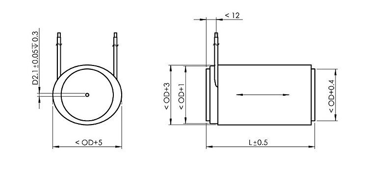 Displacement | Diameter OD | Length L | Blocking force | Stiffness | Electrical capacitance | Resonant frequency | |