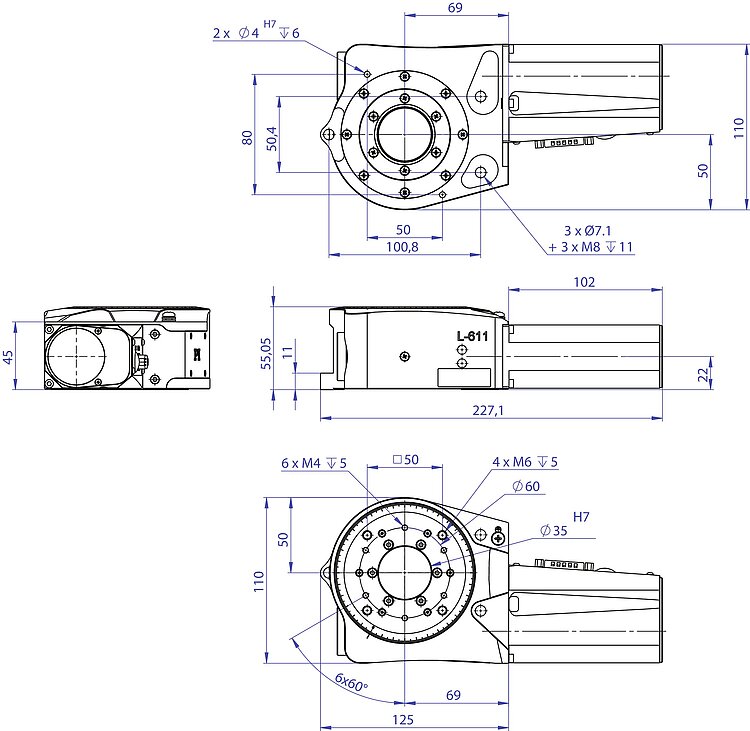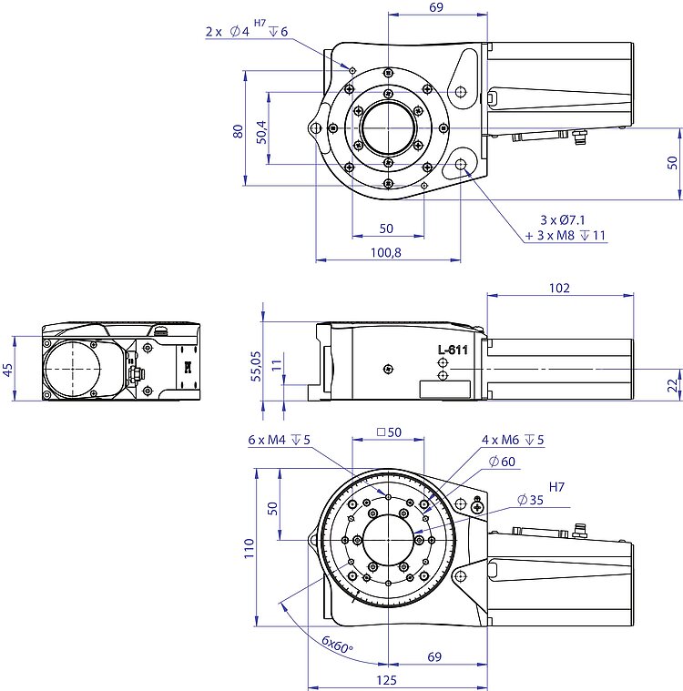 High-precision positioning due to low-play preloaded worm gear. Preloaded pivot bearings for high run-out accuracy. Clear aperture with 35 mm Ø. Unlimited travel range in both directions of rotation. Noncontact reference switch. Compact multi-axis positioning systems possible with L-511 linear stages and L-310 Z stages. Vacuum-compatible product variants on request.
