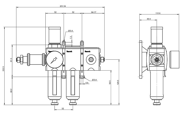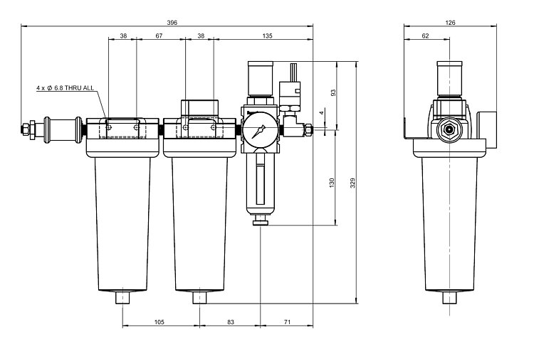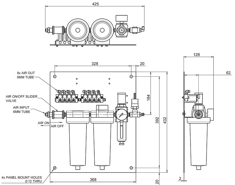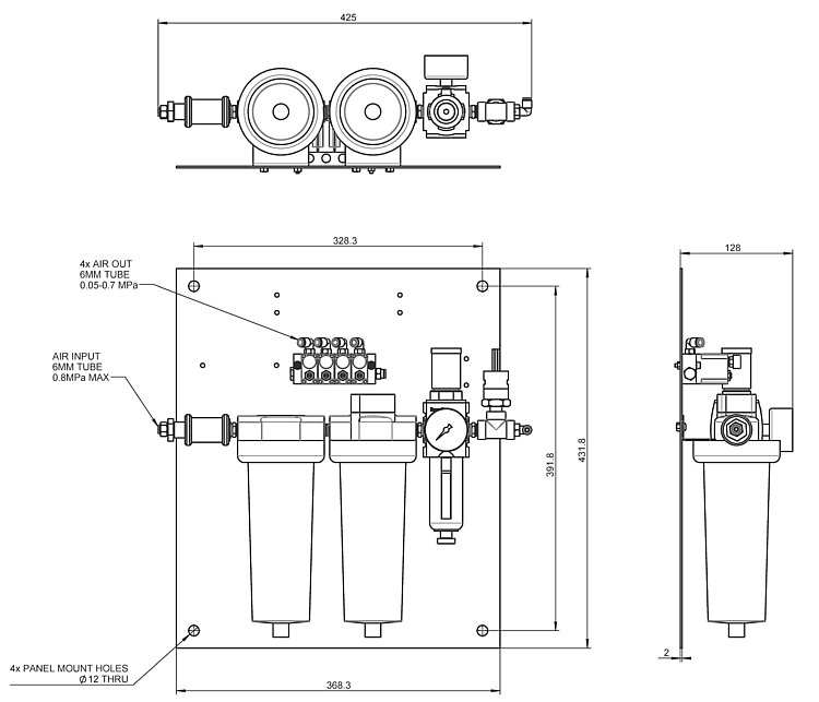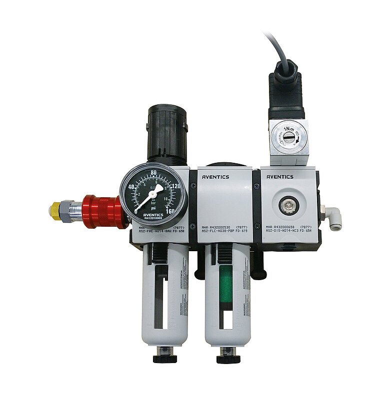 - Cleans and filters the compressed air supply, controls the supply pressure