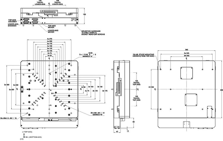 Ultra-precision direct drive XY stage; ironless 3-phase linear motor; 310 mm × 310 mm travel range (X × Y); 500 N load capacity; 1000 mm/s × 1000 mm/s maximum velocity; incremental linear encoder, 1 nm sensor resolution, sin/cos, 1 V peak-to-peak